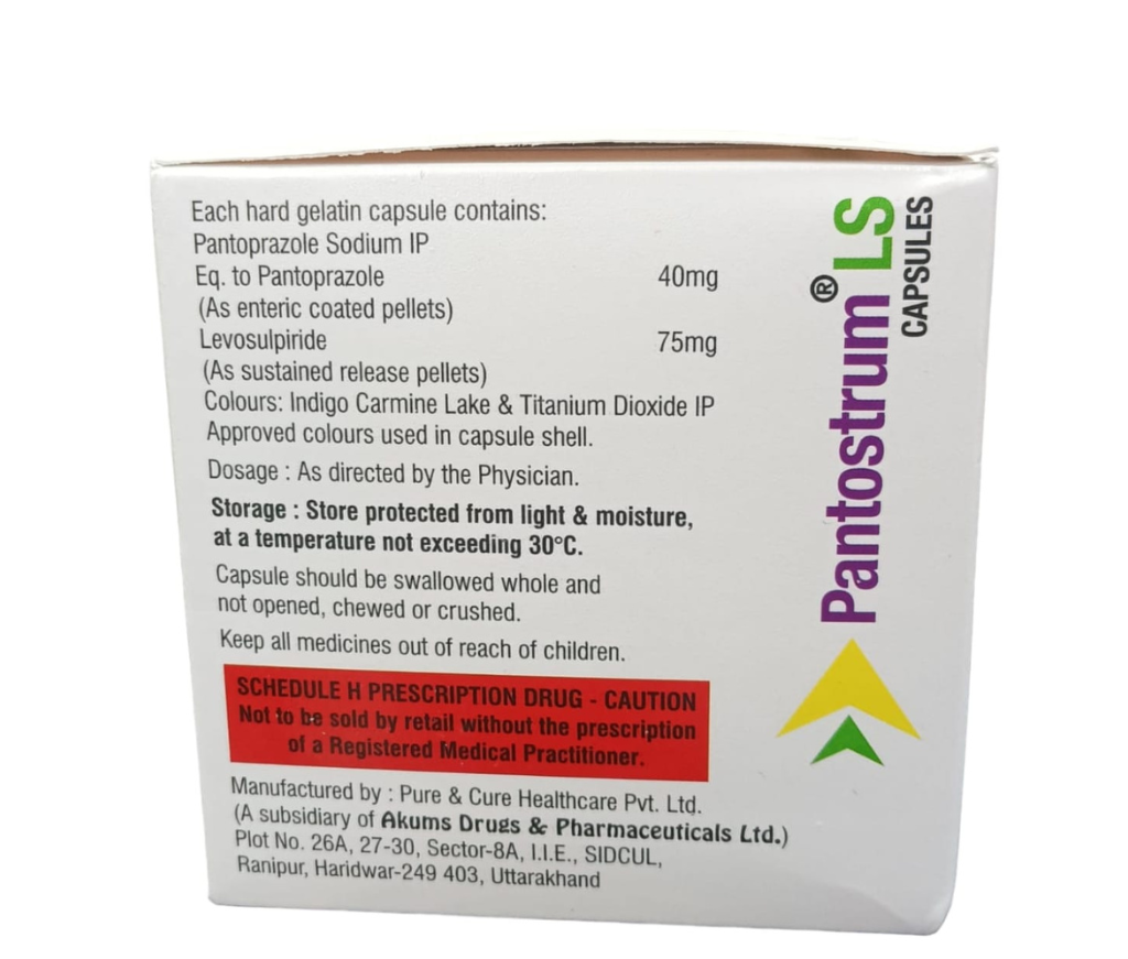 PANTOSTRUM LS is a powerful combination medication designed to address various gastrointestinal disorders, particularly those related to acid reflux and motility disorders. It contains Pantoprazole, a proton pump inhibitor (PPI), and Levosulpiride, a prokinetic agent. Together, these ingredients provide a comprehensive approach to managing conditions like gastroesophageal reflux disease (GERD), functional dyspepsia, and other related ailments. The sustained release (SR) formulation of Levosulpiride ensures prolonged action, enhancing the therapeutic efficacy of the medication.