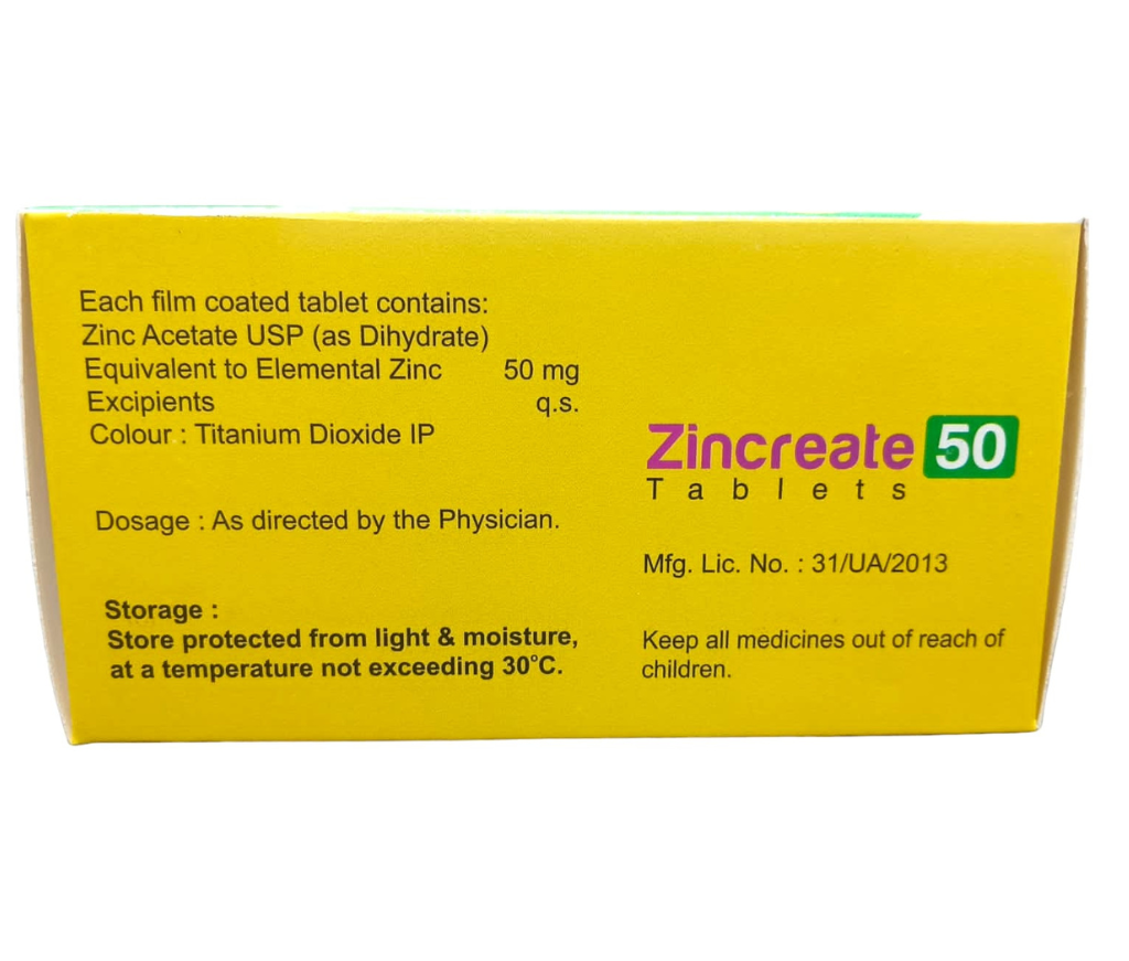 Zinc acetate is a form of zinc salt commonly used in supplements and medications. Each ZINCREATE 50 tablet contains 50mg of zinc acetate, providing a potent dose of this essential mineral. Zinc acetate is favored for its high bioavailability, meaning it is easily absorbed and utilized by the body.